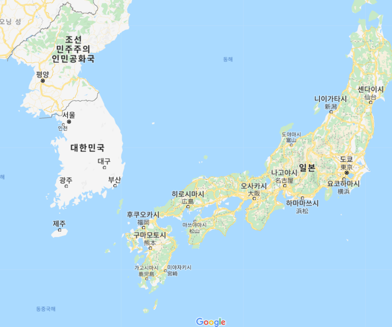 위치는 좀 생각보다 다른데 지도에서 보이듯이 동쪽 끝에 있는 도쿄는 위도 상(평면지도 왜곡이 좀 있긴 하나) 우리나라 대구랑 거의 비교를 해야 할정도로 우리나라 기준 상당히 남쪽에 있는 편입니다. 생각보다 일본은 아래쪽으로 길게 늘어뜨려져 있어서 우리나라랑 1대1로 위치가 대응되지는 않는 편. 오사카도 부산보다 밑인 목포랑 비슷합니다.